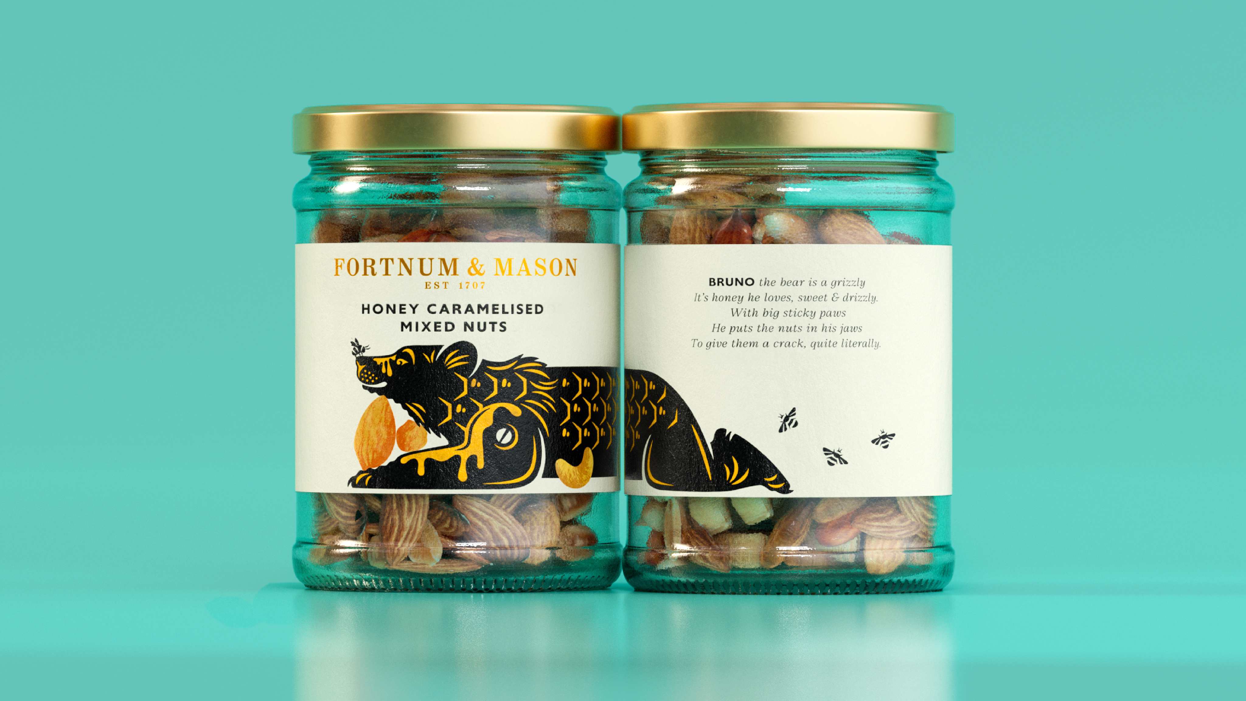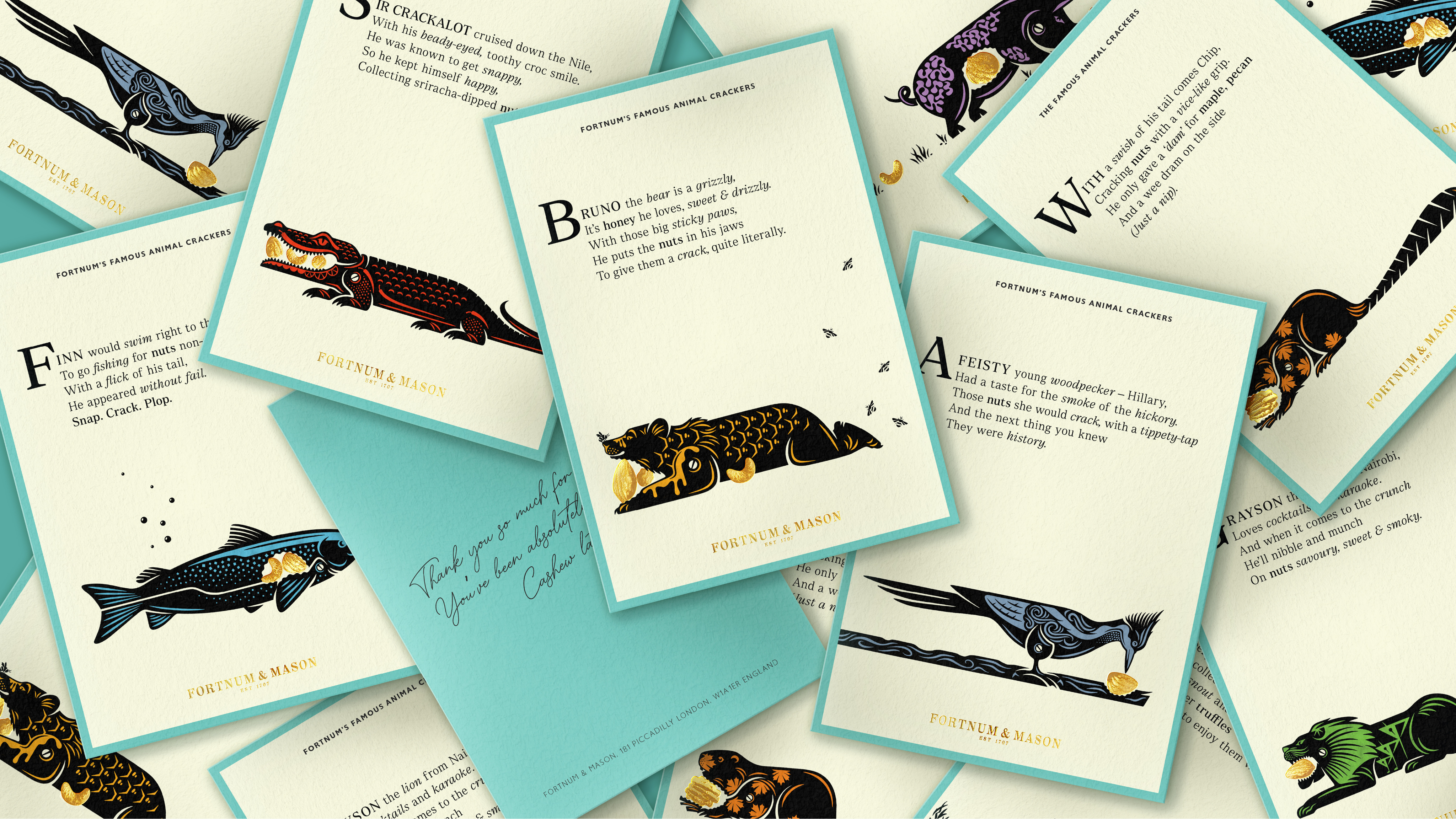 Adding more whimsicality to our illustrations, each character is accompanied by their own original, limerick-style verse; part of a cohesive story uniting them in their quest to find the finest nut selections. These verses draw influence from the work of Edward Lear; celebrated Victorian artist, illustrator, author and nonsense poet.